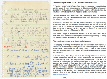 The year before he died, David talked to Wally about doing Times Four, last performed in the 70’s and not seen in its entirety since. Of the 1975 version, the only fragments on record include a grainy video of some of it being taught in rehearsal, Valda’s handwritten notes of some of the score and a few still photos. Much of the material has no record at all. Now, three years later, Wally is in the studio with Molly, preserving and building on the 1975 fragments, imagining a Times Four for 2025.